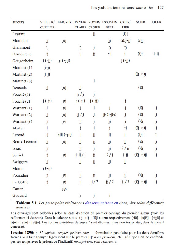 « En ce qui concerne la description à proprement parler des terminaisons -ions et -iez, il apparaît clairement que pour certains locuteurs, le [jj] géminé est une variante emphatique de la marque [j] de l’imparfait de l’indicatif et du présent du subjonctif — non seulement pour les verbes du type JOUER (vous jouiez [vu ʒujje]), mais probablement aussi pour les autres (vous cueilliez [vu kœjje], vous noyiez [vu nwajje], vous copiiez [vu kɔpijje]). Les formes en -ions et -iez des verbes du type SCIER / COPIER peuvent donc avoir jusqu’à trois variantes, p. ex. [kɔpje], [kɔpije] et [kɔpijje]. La première — la plus usuelle dans la langue spontanée — reflète la planification phonologique /kɔpjje/ formée (en termes morphématiques) du radical /kɔpj-/ suivi de /-je/, alors les deux autres sont formées à partir d’un autre radical /kɔpi-/, suivi respectivement de /-je/ et de /-jje/. »