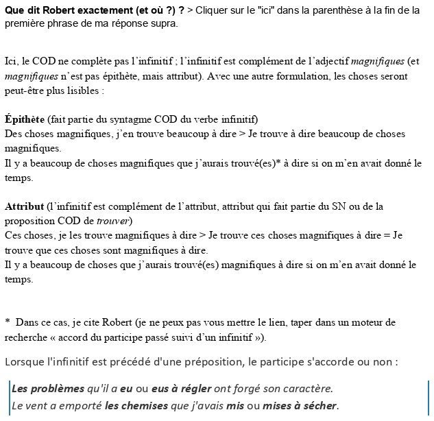 Dans la mesure où je peux écrire « j’aurais trouvé beaucoup de choses magnifiques à dire » comme « j’aurais trouvé à dire beaucoup de choses magnifiques », un autre accord du participe passé n’est-il pas aussi possible ? « Beaucoup de choses que j’aurais trouvées magnifiques à dire ». Peut-être « magnifique » a-t-il un rôle sur l’accord ?