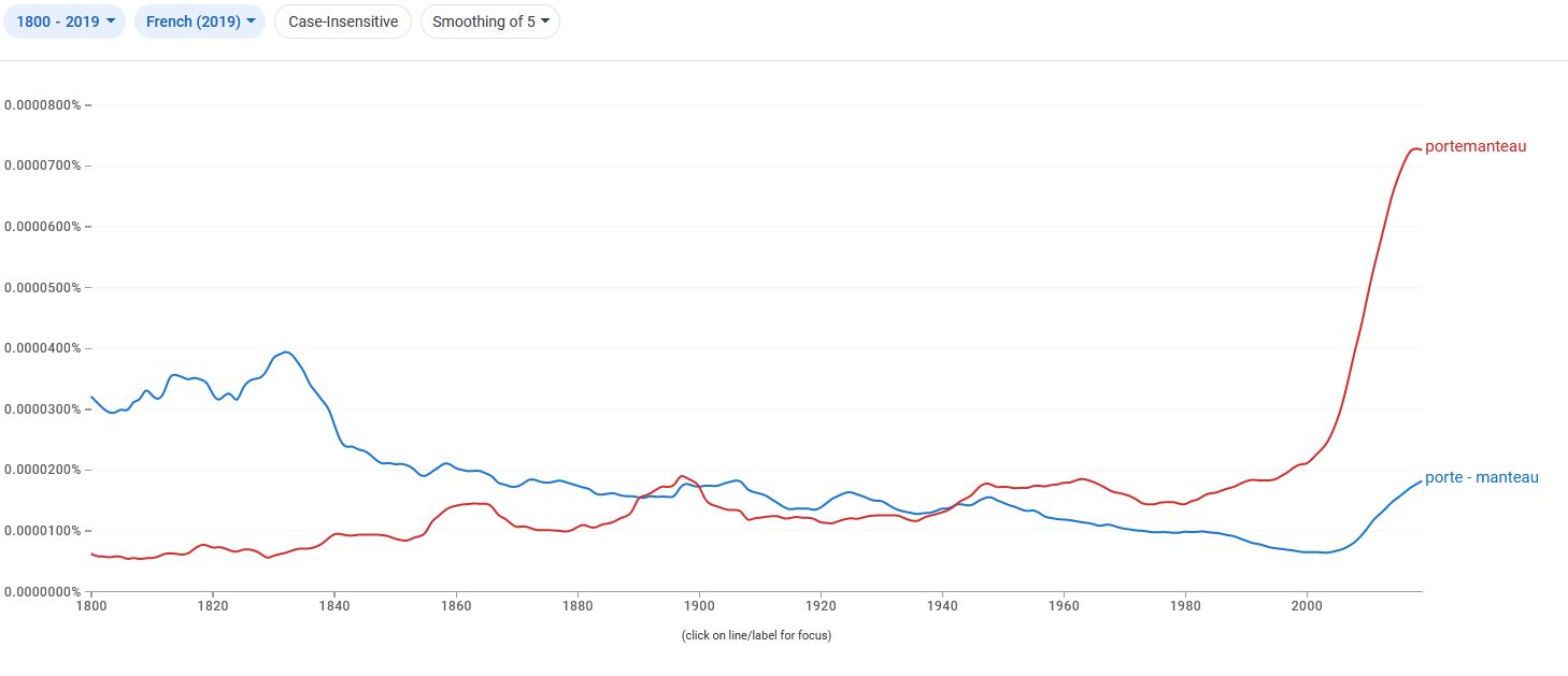 N.B. Ce qui m’interroge en regardant votre graphisme, c’est la remontée de la graphie « porte-manteau » après 2000. Certes, elle est sans commune mesure avec l’autre (sans le trait d’union), mais elle est réelle. Il serait enrichissant de savoir pourquoi, car personnellement, sur ce coup-là, je ne vois aucune raison logique à cela.