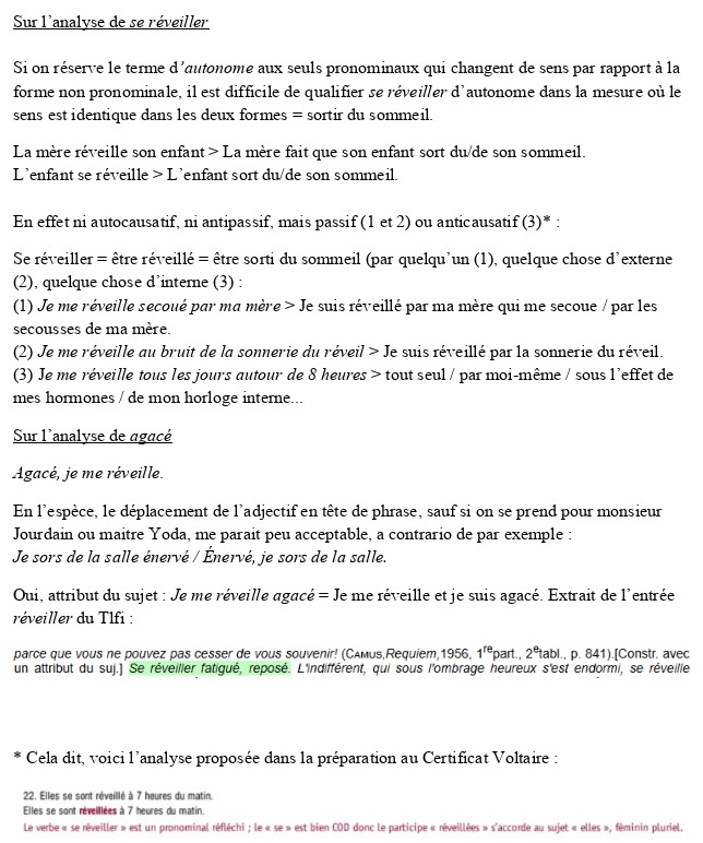 En revanche, je ne comprends pas l’analyse proposée dans la préparation au Certificat Voltaire. Va savoir comment « se réveiller » est réfléchi. Marie réveille Marie ? Son « âme » sort de son corps et envoie une grosse baffe à son enveloppe corporel sur sa propre décision ? Comme on le fait tous évidemment. lol